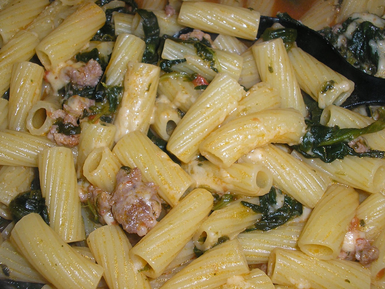 Ho dorato un spicchi d'aglio tritato in olio d'oliva,ho aggiunto la pasta di salsiccia ed ho rosolato;ho sfumato col vino bianco secco ed ho unito mezza scatola di pomodori pelati....nel frattempo ho cotto cubetti di spinaci surgelati in due dita di acqua e,dopo averli ben strizzati,li ho uniti alla salsiccia